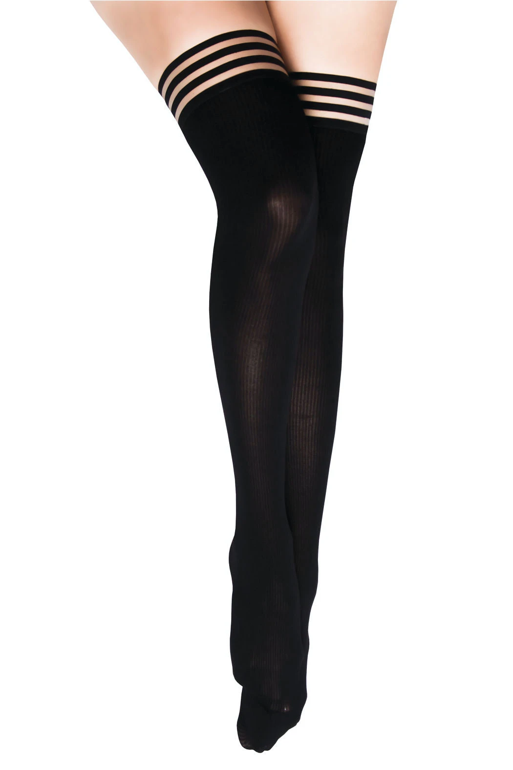 Slip into these black thigh high stockings with a subtle ribbed pattern from high-quality hosiery brand, Kix’ies. These black stockings are guaranteed to stay up all day long with their no-slip grip. Available in petite to plus sizes.