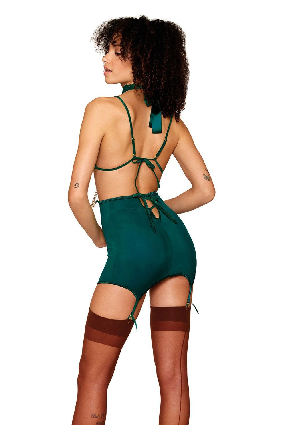 Strut your stuff with the Peacock Garter Skirt Set. This four-piece ensemble features a triangle bralette and high-waisted garter skirt, both made with luxurious gold-corded lace and mesh. Complete the look with the elegant lace collar, adorned with a sparkling gold rhinestone chain. Plus, the adjustable straps and tie back closure ensure a perfect fit.