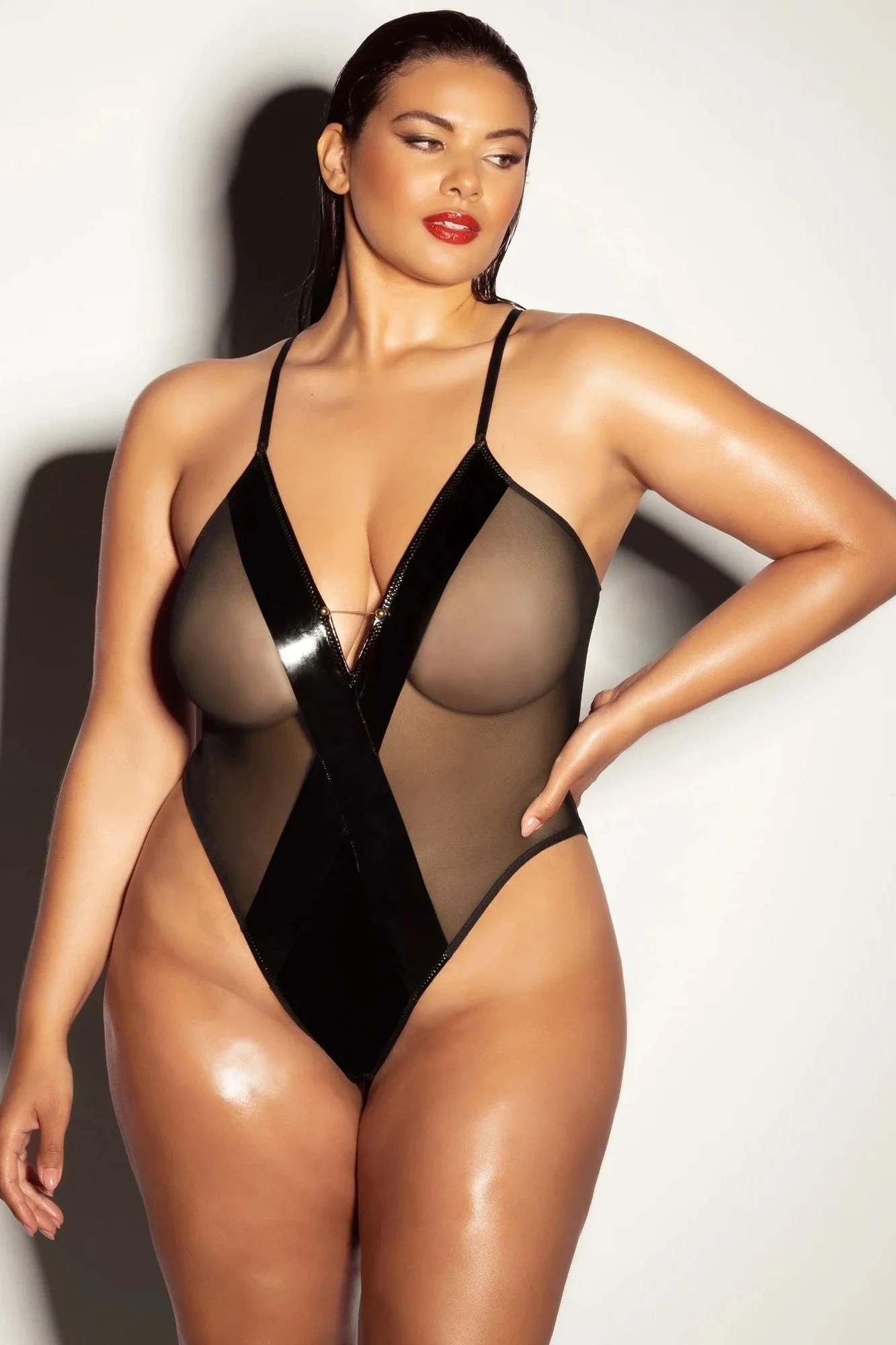This sultry plus size Barbell Teddy combines high quality vinyl and mesh for a bold look that turns heads. Elaborate barbell trim adds an extra hint of excitement, while adjustable straps ensure a comfortable fit that flatters your curves.