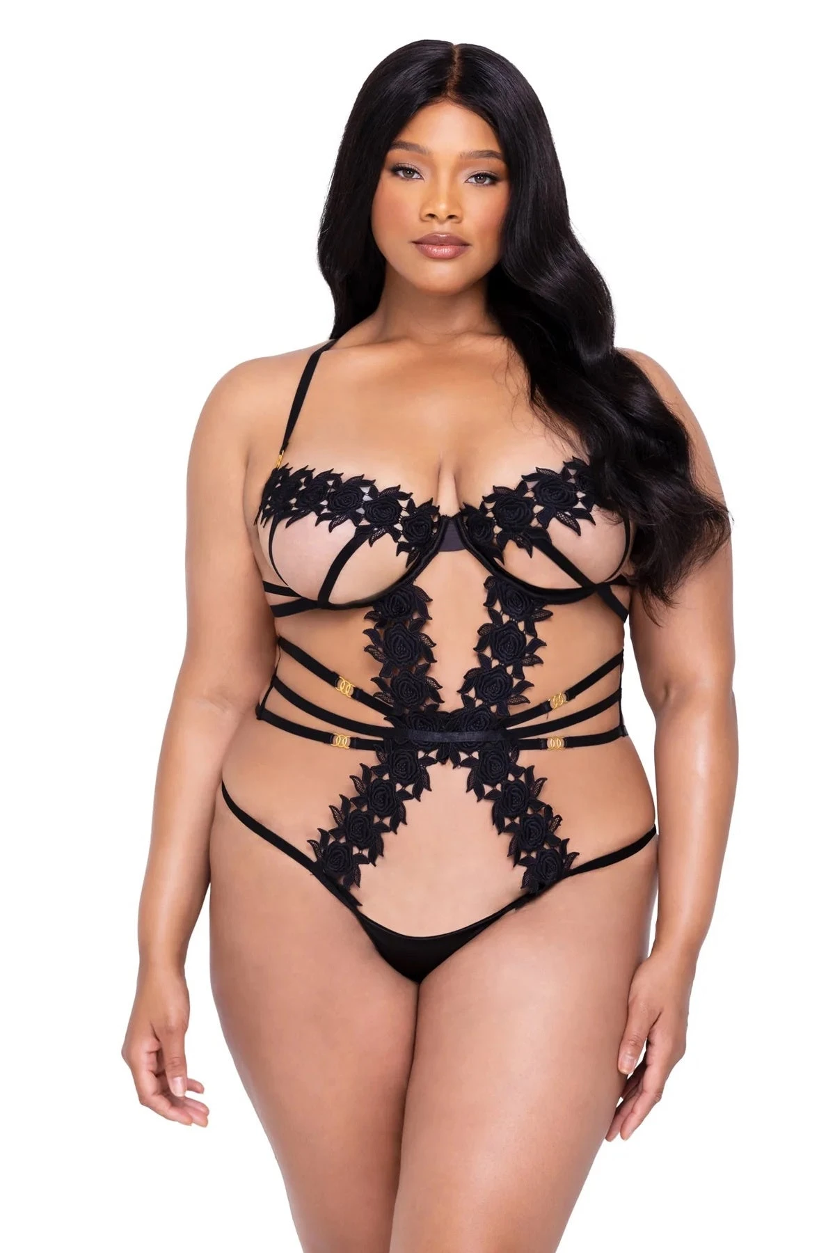 Enjoy the seductively shaped silhouette of the Rosa Teddy. Soft guipure lace and tulle add a sweet feminine touch while steel boning, hook and eye closure, and underwire and guarantee a secure and comfortable fit.