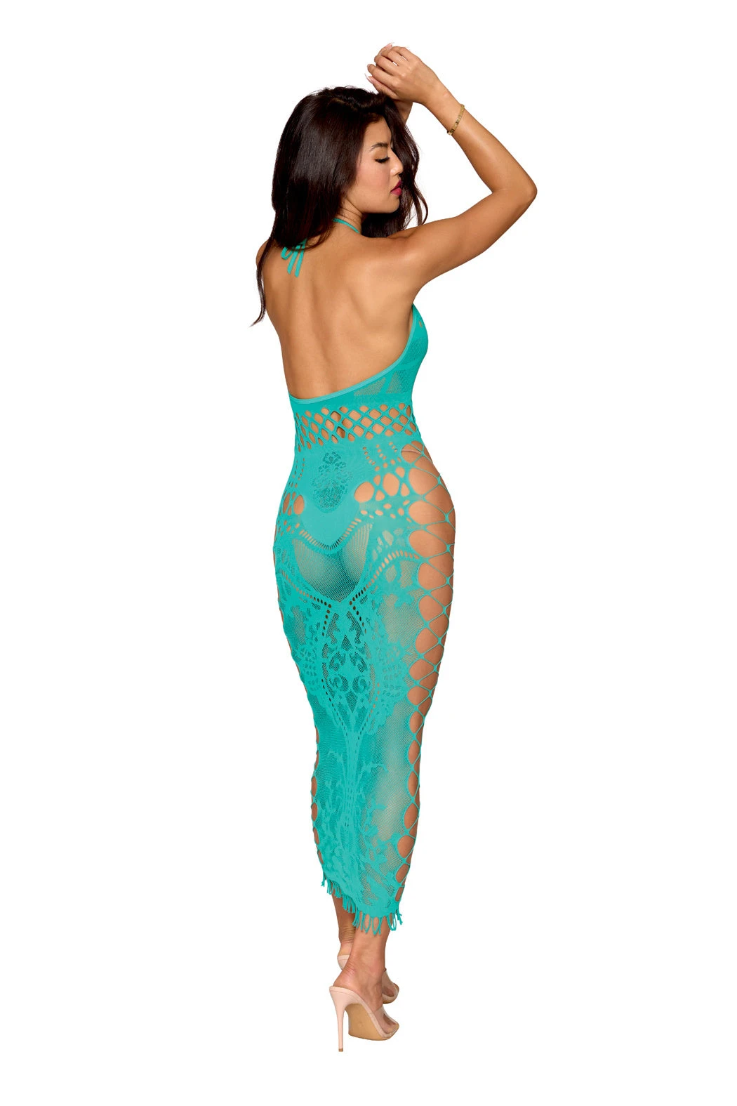 This Turquoise Halter Gown is a seamless bodystocking gown with a custom-designed pattern that will accentuate every curve. The halter neck ties provide a perfect fit while the faux lace-up sides add a touch of tease. The fringe hemming adds a playful flair.